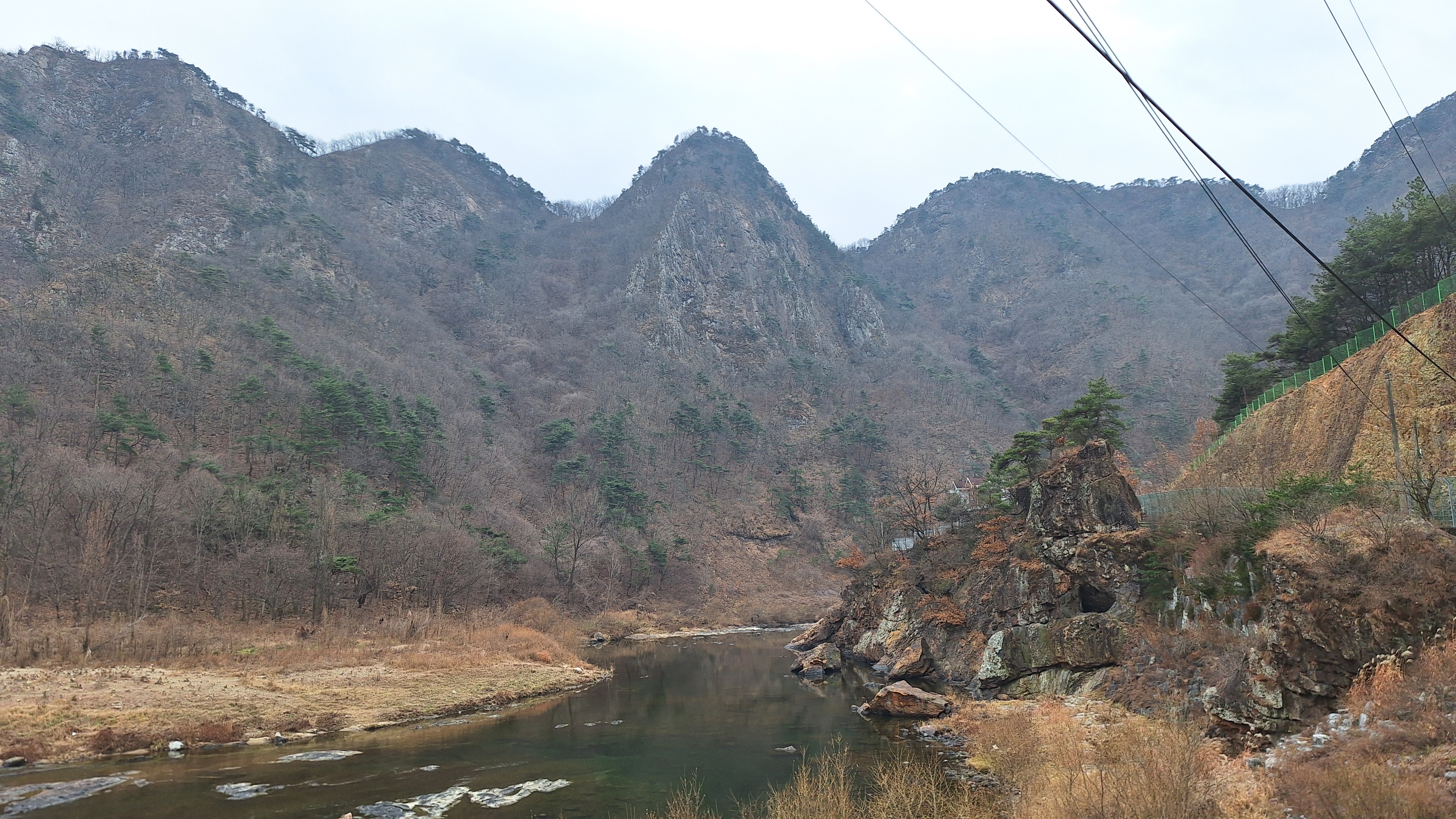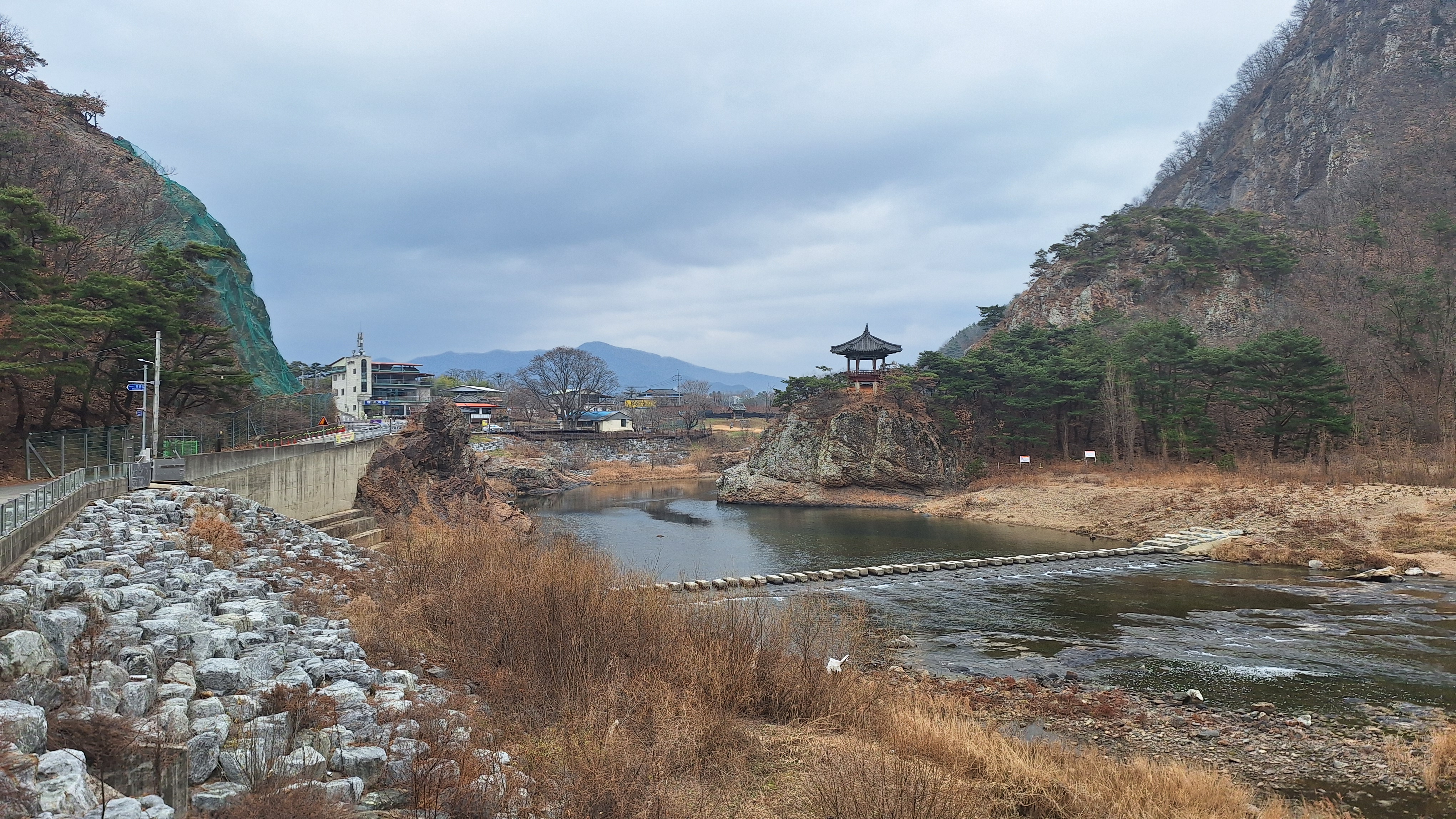 (11:45) 집중호우시나 빙판일 때는 건널 수 없는 징검다리로 추운 날씨에 산행이라 징검다리가 약간 얼어있어 미끄러움으로 조심해서 건너며 월류봉을 담아봅니다.