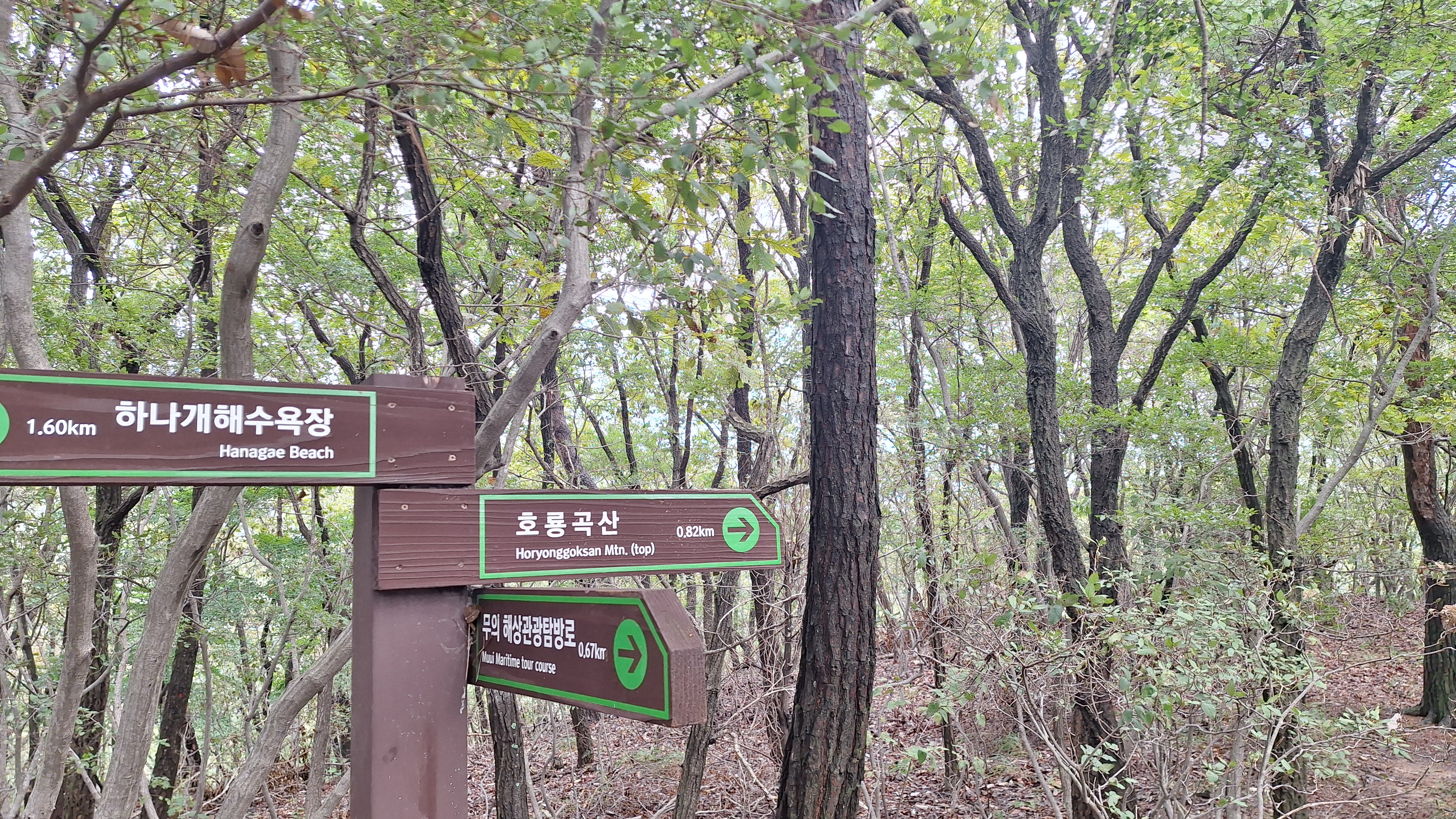 해상 관광 탐방로 입구에서 해상관광 탐방로를 거치지 않고 숲길로 직진하여 오르는 삼거리에서 우측 호룡곡산으로 오릅니다.