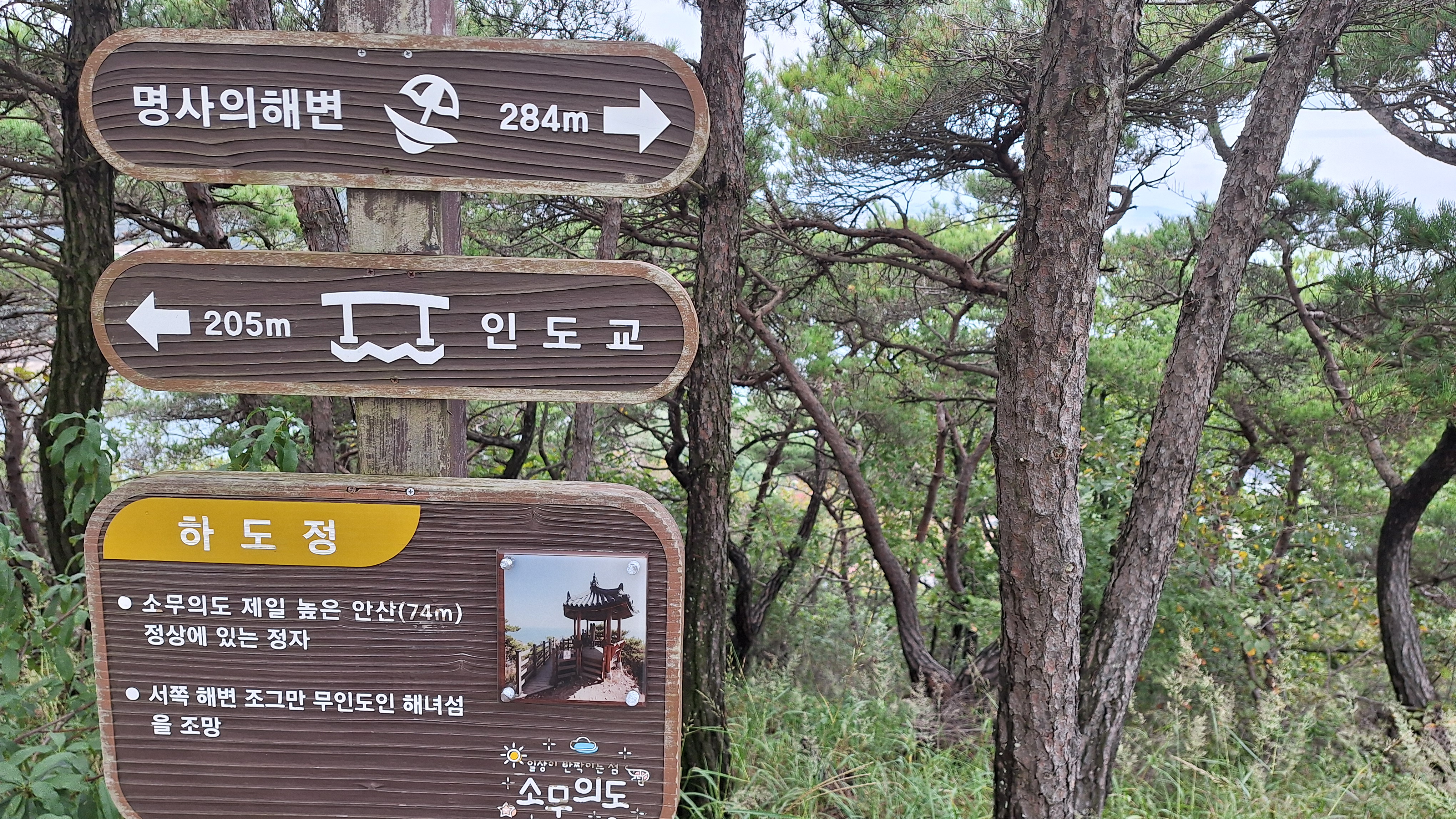 정상에서 5분 정도 걸어 삼거리에서 소무의도로 가려면 광명항으로 ~ 이정표에서 소무이도 인도교까지는 40분 걷게 됩니다.